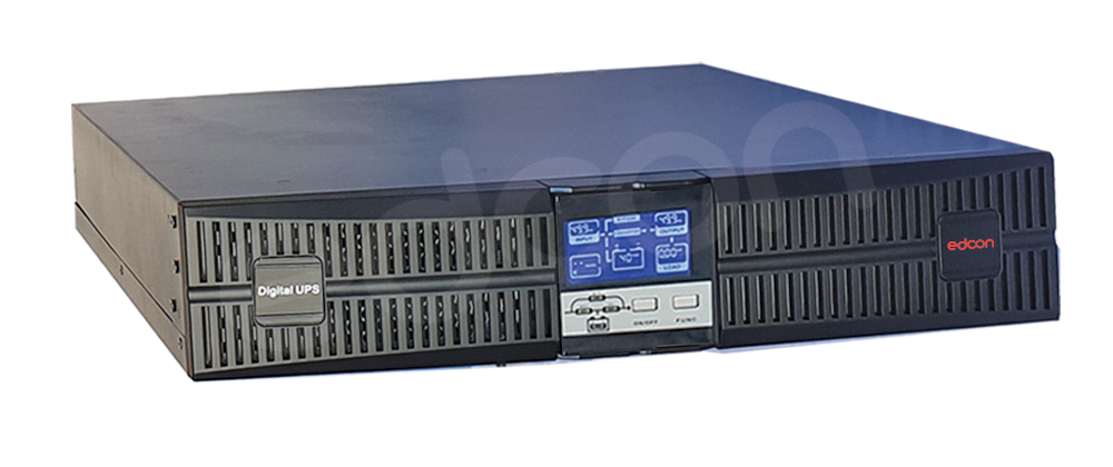 Spesifikasi Lainnya True online smart UPS, bentuk: rackmount/tower, 1-1 phase, pure sine wave, built-in AVR, DSP controller, LCD display, push button, LED indicator. Input: 110-290 VAC, Freq 40-70 Hz, PF ≥ 0.98. Output: 220/230/240 VAC ±1%, Freq 50/60 Hz ±0.1Hz, PF 0.9. Overload: 105%-125% (50sec), 150% (25sec), ≥ 150% (300ms). Proteksi: overload, overcharge, low/high voltage, short circuit, voltage/frequency fluctuation, surge, power blackout. Alarm untuk kondisi abnormal. Communication port: RS232/USB, Dry contact, Parallel kit (optional), SNMP (optional).